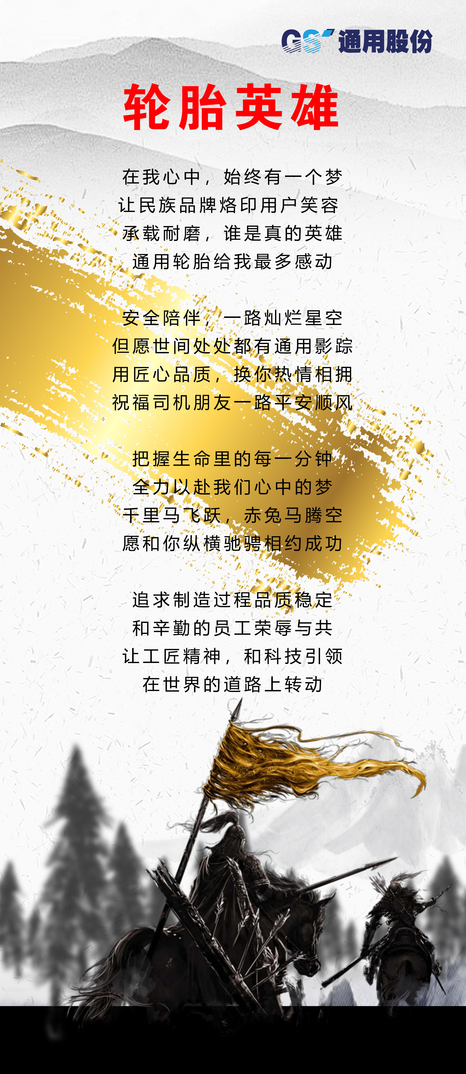 今年9月是中國第四十一個“質量月”,也是通用股份第十四屆“科技質量月”。滄海橫流,自強不息,方顯英雄本色。今年,通用股份以一首創(chuàng)編的《輪胎英雄》拉開了“科技質量月”的帷幕,在這個風起云涌的競爭時代,全體通用人堅守初心,以振興民族品牌為己任,為向廣大消費者提供更加卓越的產品與服務而不斷努力奮斗,推動企業(yè)邁向高質量發(fā)展。