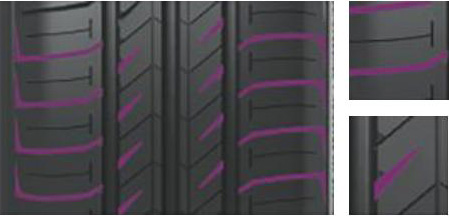 三條優(yōu)化寬度的縱向排水溝保障了輪胎的濕地排水性能,有效防止了輪胎的側(cè)向水滑。