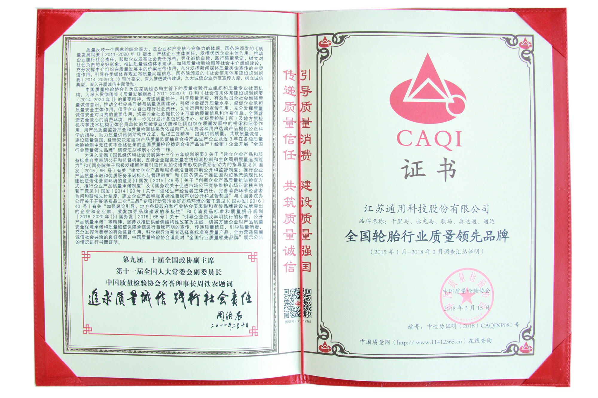 近日,在由國家質(zhì)檢總局和中國質(zhì)量檢驗協(xié)會聯(lián)合開展的“產(chǎn)品和服務(wù)質(zhì)量誠信承諾”主題活動中,通用股份榮獲“全國產(chǎn)品和服務(wù)質(zhì)量誠信示范企業(yè)”、“全國輪胎行業(yè)質(zhì)量領(lǐng)先品牌”稱號。