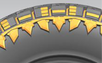 外觀富有立體感,更加強(qiáng)壯,為胎側(cè)提供有效防護(hù),提高耐撞耐刺性能;花紋溝底部增加彈石子結(jié)構(gòu),保證花紋抓地力 。